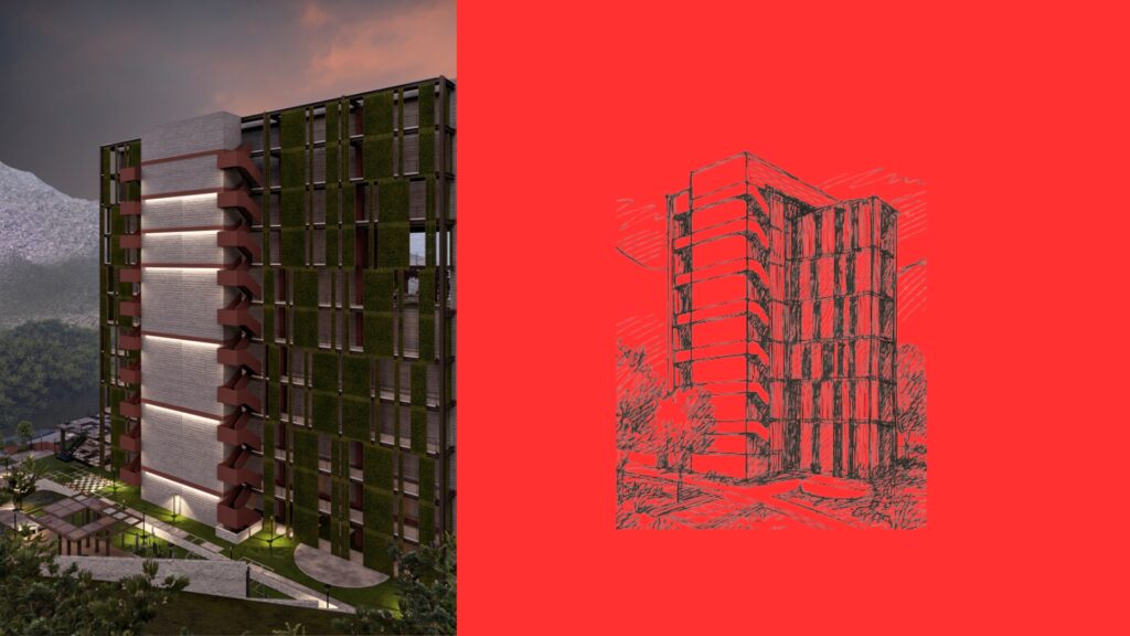 Su look arquitectónico combina estructura expuesta, líneas sobrias y un lenguaje contemporáneo que resalta la verticalidad y la ligereza del proyecto. La incorporación de vegetación en las fachadas suaviza su presencia urbana, generando un equilibrio entre eficiencia espacial y sensibilidad natural.